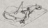 后肢的前方转位保定法见(图2-1-07)。在松解保定时,应先松开对四肢的捆绑,然后再抽去颈部的木棒,即可打马使驴站起。