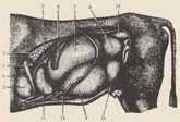 4.盲肠 长约lm,在腹腔右侧,自右髂部上方向前下方沿腹壁伸延至剑状软骨部。可分为盲肠底、体、尖三部分。盲肠体下1/2部和盲肠尖游离性甚大;结肠,分为大结肠和小结肠。大结肠象双蹄铁状重叠在一起,形成上层大结肠和下层大结肠。下层大结肠,起始于盲结口止于骨盆曲,区分为右下大结肠、胸骨曲、左下大结肠、骨盆曲;上层大结肠,起于骨盆曲止于小结肠,区分为左上大结肠、膈曲、右上大结肠、胃状膨大部,然后延接小结肠(图10-2-16)。