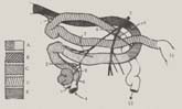 2.小肠 分为十二指、空肠和回肠。十二指长约lm,分为三段,第一段(乙状弯曲),第二段(后曲),第三段(空肠回肠曲)。空肠长约20m,形成迂回曲折的肠袢,系于前肠系膜上,前肠系膜长达50cm,系膜附着在第一、二腰椎处。回肠长约lm,肠壁厚,弯曲少,从左髂部斜向左右上方到第三、四腰椎下方连接盲肠(图10-2-15)。