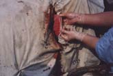 (4)瘤胃缝合胶布固定法 显露瘤胃后,用一70cm、中央带有6cmXl5cm长方形的塑料布或橡胶洞巾,将瘤胃壁浆膜肌层与中央孔的四个边连续缝合,,使中央长方形孔缘紧贴在瘤胃壁上,形成一个隔离区。于瘤胃壁和洞巾下填塞大块生理盐水纱布,将橡胶洞巾四个角展平固定在切口周围,在长方形孔中央切开瘤胃(图10-8-10),
