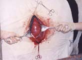 五、手术方法 切开皮肤18~20cm,对出血点进行止血,切开皮下组织。切开腹外斜肌,腹内斜肌,按肌纤维方向分离腹横肌。用镊子夹持腹膜形成一皱襞,切开腹膜,以防误切扩张、积液的真胃。显露腹腔及变位扩张的真胃,绝大多数病牛位的真胃已移至右肷部,也有少数病牛的真胃移位到右侧肋骨弓内侧,呈极度扩张状态。( 视频121、图10-11-06、图10-11-07)