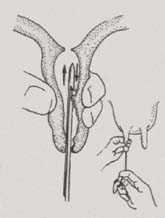 有严重瘢痕收缩病例,可施行乳头管切开术。消毒乳头后,先挤去一些奶,借以排除可能存在乳头管末端的细菌。然后用消毒过的双刃或多刃乳头管刀,快速插入乳头管,用挤奶的办法扩张乳管,此时,乳头管刀在乳头管内转动90度,后拔出乳头管刀,使乳头管造成十字形切口(图15-1-04)。术后插入带有螺丝帽的乳导管或乳头管扩张塞,直至创口痊愈为止。